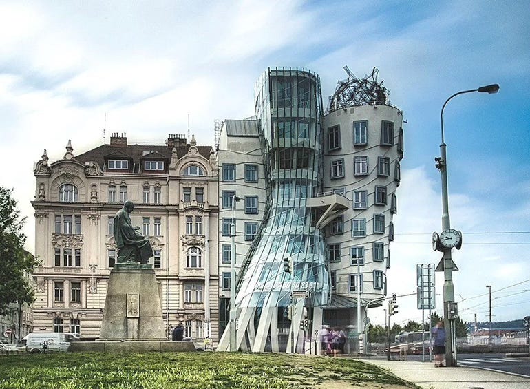 Of course, the quaint urban centers of Europe are themselves far from innocent, architecturally speaking. Much of what we build today degrades what came before. Look no further than the deconstructivist Dancing House, which looks like an infection on the elegant classicism that preceded it.